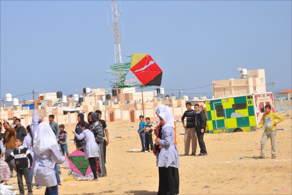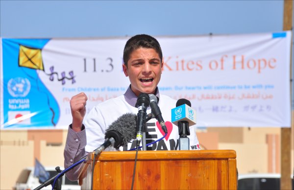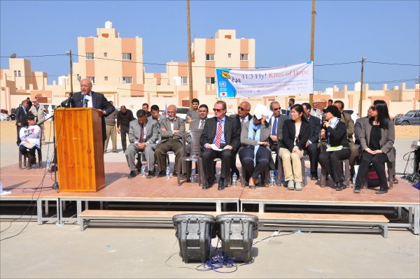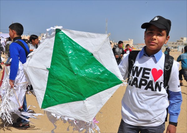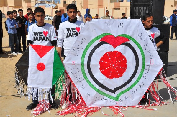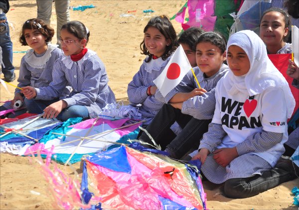 غرب خان يونس- مقابل عيادة الوكالة - الإثنين الموافق 11-03-2013 أ طلقت وكالة الغوث وتشغل اللاجئين الفلسطينيين – الاونروا بغزة فعالية بعنوان "طائرات الأمل" لإحياء ذكرى مأساة زلزال تسونامي في اليابان عام 2011. وتخلل الفعالية إطلاق أطفال مدارس وكالة الغوث المئات من الطائرات الورقية التي تحمل ألوان علم اليابان وعلم فلسطين ورفع علم دولة اليابان وفلسطين إلي جانب الموسيقى والهتافات داعمة لأطفال اليابان.