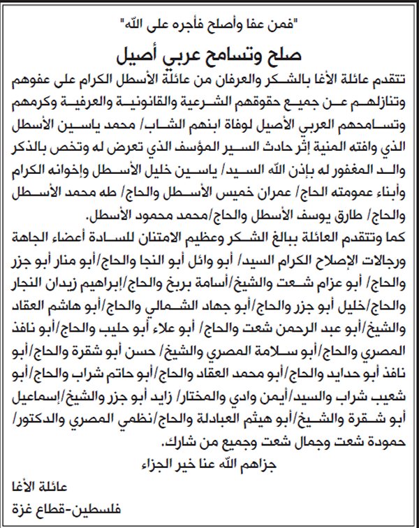 ديوان آل الأسطل، السطر الغربي- خان يونسالجمعة الموافق 12-04-2013 صلح عشائرى بين عائلة الأغا وعائلة الأسطل أثر حادث السير المؤسف الذى حدث بتاريخ 07-03-2013 أودي بحياة الشاب محمد ياسين خليل سليمان ميلاد سلطان عثمان أحمد كتخده الأسطل، وتوجهت جاهة من رجالات الإصلاح من جميع أنحاء محافظات قطاع غزة، تقديراً وإحتراماً لآل الأسطل الكرام بعد أن قرروا العفو الكامل راجين الأجر والثواب من الله العلي القدير .