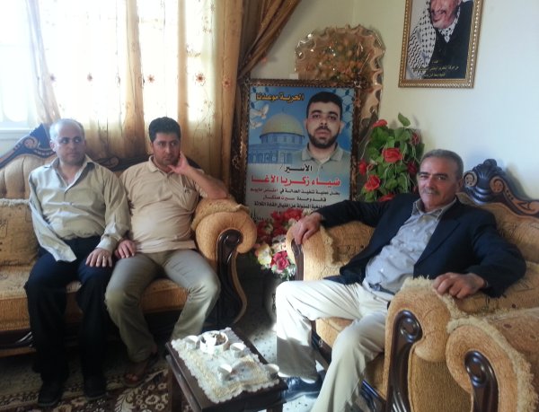 خان يونس- السطر الغربي- منزل والدة الأسيرين ضياء ومحمد الأغا- 5/5/2013م، شاركت مجموعة من شباب عائلة الأغا بزيارة تضامنية لوالدة الأسيرين ضياء ومحمد زكريا الأغا، وبدأت الفعالية بكلمة لوالدة الأسيرين فرحبت بالضيوف وشكرت تواجدهم، وكم غمرتها السعادة لأنها رأت في كل شخص ضياء وفي كل شخص محمد، وأكدت على وقوفها هي وأمهات الأسرى إلى جنب أبنائهم وفلذات أكبادهم الأسري، ووجهت نداءاً إلى أحرار العالم وتساءلت بأي لغة نخاطبكم كي تلتفتوا إلى معاناة أبنائنا الأسرى ومعاناة ذويهم، وذرفت دموعها راجية من الله أن يكحل عينيها برؤية فلذتي كبدها الأسيرين، وقالت بأن اليوم يصادف مرور عشرة اعوام لمحمد في الأسر، فتم اعتقاله يوم 5/5/2003 ، واشارت أنه بقى لمحكوميته عامان فقط.