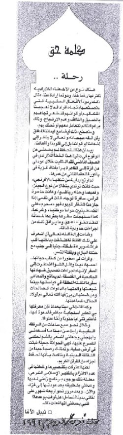 وكما قالت لي دينا بعدئذ فإن معرفتها بي تعتبر استجابة مباشرة لدعوة أمها، فاعتبرتني أبا حنونا وأخا عطوفا. وخلال نحو سبع ساعات من الرفقة الطيبة رأيت من دينا ما أسعدني وأبهجني وجعلني أشعر بالندم لحكمي المتسرع عليها فهي أقحوانة جميلة نبتت في أرض صلبة، وتمتلك رصيدا جيدا من الثقافة الدينية وتأكدت بأنها تحفظ أجزاء من القرآن الكريم، لكنها اعترفت بتقصيرها وخطئها في عدم الالتزام بالزي الإسلامي الشرعي، معللة ذلك بوجود برنامج زمني لديها وعدتني بتطبيقه بعد عودتها إلى غزة. والآن ..وبعد مرور نحو أربعة شهور على لقائي بدينا أتساءل: هل أوفت بوعدها؟ قلبي يحدثني انها فعلت ذلك !.