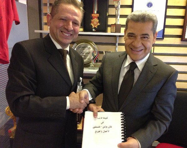 الإعلامي الشهير أ. مصطفى الأغا بعد تصفحه الكتاب مبدياً إعجابه الشديد، أ. ماجد عصام