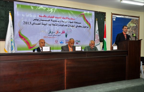 قاعة بلدية خان يونس- الأربعاء الموافق 5-6-2013 احتفلت سلطة جودة البيئة وبلدية خانيونس جنوب قطاع غزة باليوم العالمي للبيئة الذي يصادف الخامس من يونيو من كل عام تحت شعار" فكر..كُل..وفر".