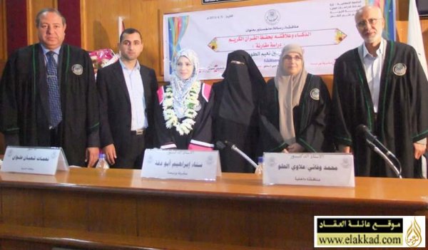 غزة- الجامعة الإسلامية- منحت الباحثة نرمين نعيم العقاد (الطويل) حرم الأستاذ محمد أحمد حامد العقاد، درجة الماجستير في علم النفس يوم الأربعاء السادس والعشرون من رجب لعام 1434هجرية الموافق ل 5/يونيو/2013 ، بعد مناقشتها لرسالة الماجستير تحت عنوانها الموسوم