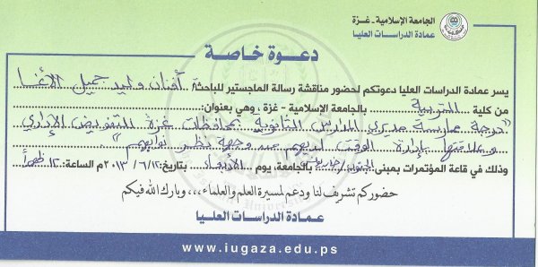تتشرف الباحثة أ. افنان وليد جميل الأغا لحضور مناقشة رسالة الماجستير، التخصص إدارة تربوية - كلية التربية بالجامعة الاسلامية، تحت عنوان: