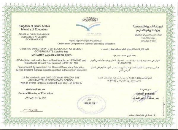 المملكة العربية السعودية- حصول الطالب الفلسطيني محمد أيمن ديب عابد على المرتبة الثالثة على مستوى المملكة، وبهذه المناسبة يتقدم جده لآمه الأستاذ صبحي مضيوف الشوربجي بالتهنئه القلبية الحارة ، وقد حصل على تقدير عام97.65، متمنيين له دوام التقد والنجاح .