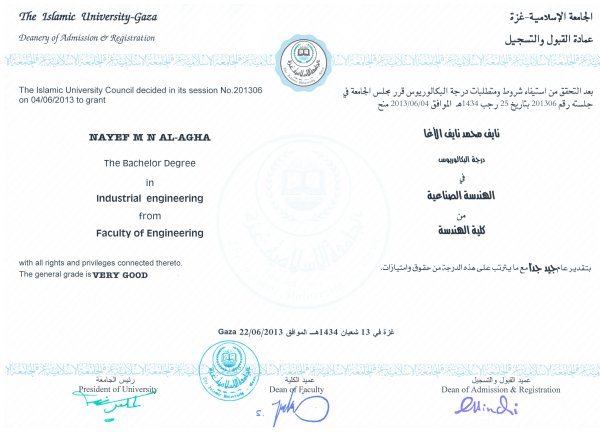 - نايف محمد نايف الأغا، قسم الهندسة الصناعية بتقدير عام جيد جداً.