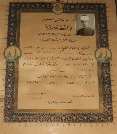 (21) الشهادة العالية لكلية الشريعة للمرحوم سماحة الشيخ كمال الاغا عام 1943