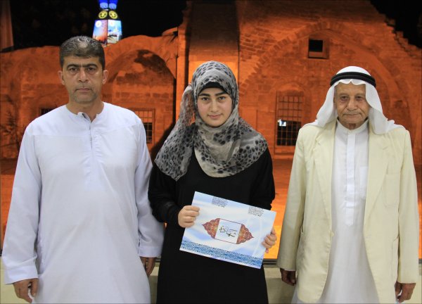 المتفوقة والحافظة لكتاب الله رواند عماد الأغا تتوسط جدها ابو يوسف ووالدها