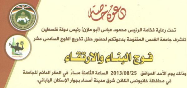 الرئيسة/نشاط/جامعة القدس المفتوحة- دعوة لحضور حفل تخرج الفوج السادس عشر نشاط جامعة القدس المفتوحة- دعوة لحضور حفل تخرج الفوج السادس عشر تاريخ النشر : الإثنين | 19-08-2013 | 15:28 14127 بسم الله الرحمن الرحيمصورة للمبنى الجديد لجامعة القدس المفتوحة اضغط هنا للتواصل أو التعرف على الأستاذ محمد أحمد عودة فالوجي الأغا يمكنك تلقي أحدث الأخبار أول بأول بانضمامك لإحدى مجموعات الواتساب الخاصة بالعائلة من خلال الضغط هنـا اظهر المزيد