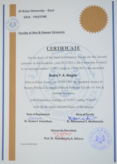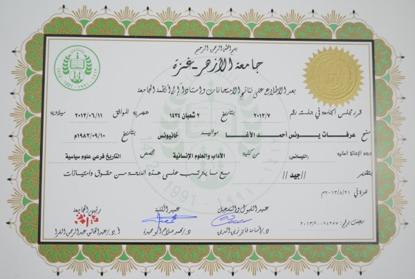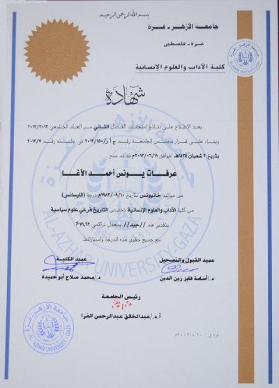 تخرج الطالب عرفات يونس أحمد الأغا في جامعة الأزهر- غزة، وحصوله على درجة البكالوريوس من كلية الأداب والعلوم الإنسانية تخصص تاريخ وعلوم سياسية، وألف مبارك