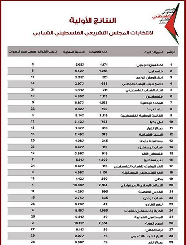 القائمة التي حصلت على أعلى نسبة اصوات في انتخابات المجلس التشريعي الشبابي