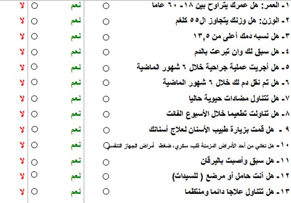 • إذا أجبت على  الأسئلة من 5-9 بنعم ومن 10-13 بلا فأنت مستثنى مؤقتا من التبرع بالدم لحين زوال السبب.
