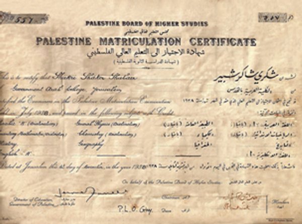 - حاز على شهادة «المترك» عام 1938 ونال المرتبة الاولى على مستوى فلسطين.