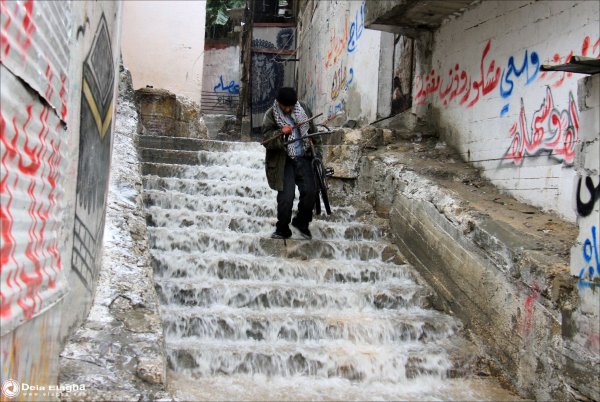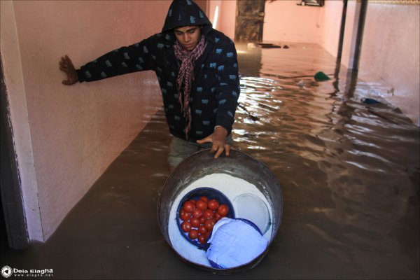 شاب فلسطيني يقوم بإخراج الطحين من داخل البيت بعد أن إمتلأ بماء الأمطار