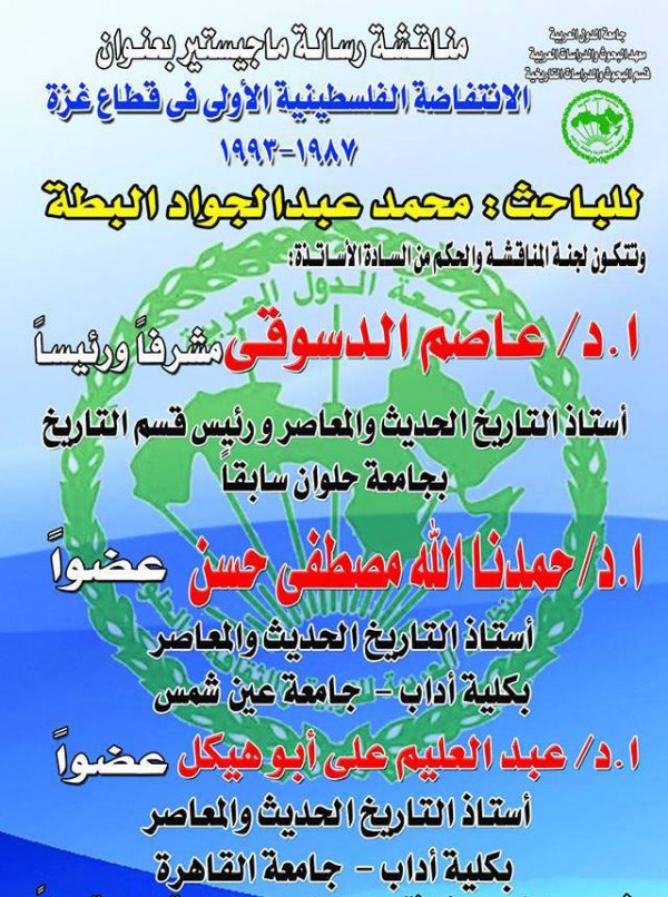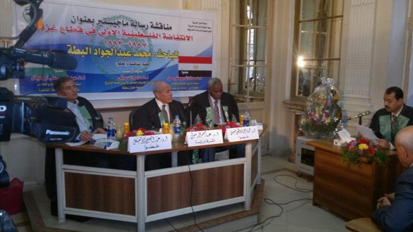 مصر- جامعة القاهرة- كلية الأداب- حصول الباحث محمد عبد الجواد محمد عبدالقادر البطة على درجة الماجستير، بعنوان الإنتفاضة الفلسطينية الأولى، وألف مبارك