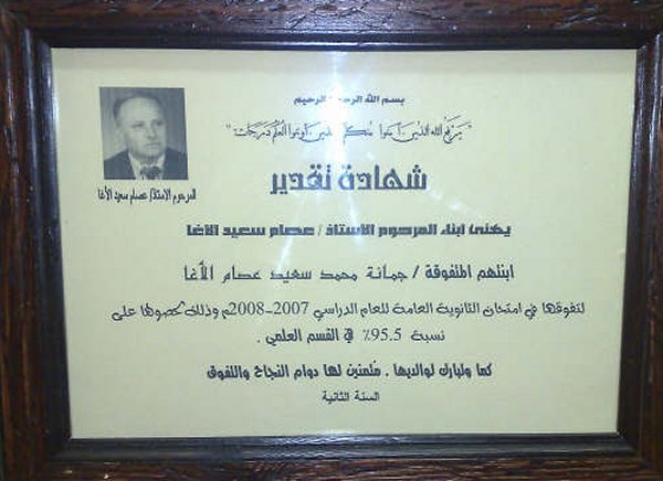 جائزة المرحوم الاستاذ عصام سعيد الاغا مقدمة للعشر الاوائل من ابناء عائلتها للسنة الثانية على التوالي