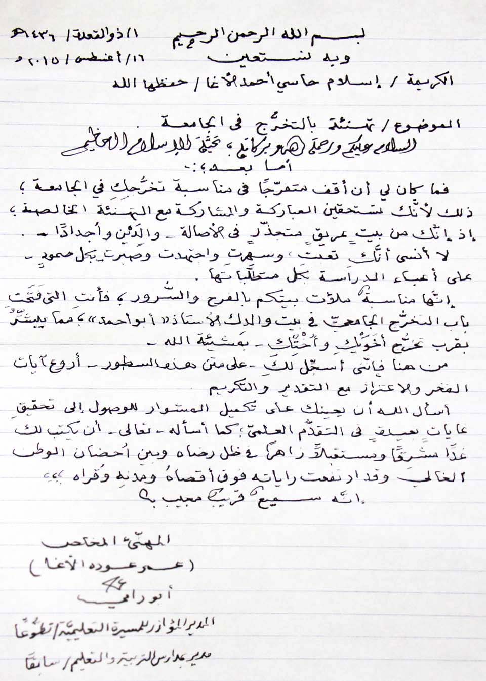 تهنئة من أ.عمر عودة الاغا