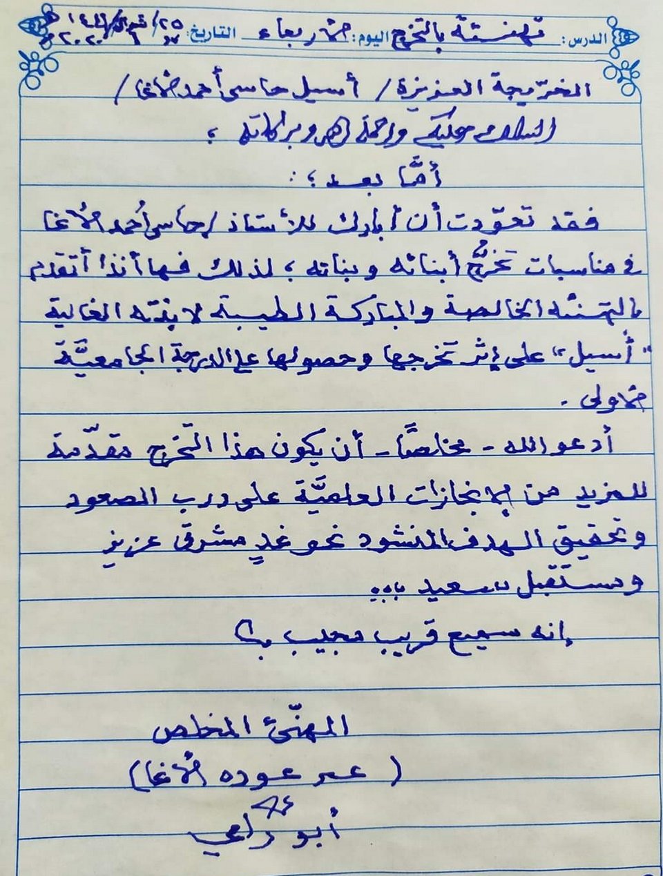 العنوان: جامعة فلسطين- تخرج أ.أسيل حاسي الاغا