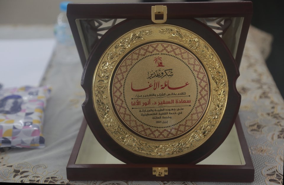 و في ختام اللقاء كرمت عائلة الاغا ابنها البار سعادة السفير داتو د.انور الاغا حيث قدم له مختار العائلة درعا يحمل عبارات الشكر و التقدير و الاعتزاز بدوره الكبير،في خدمة الشعب الفلسطيني و قضيته العادلة.